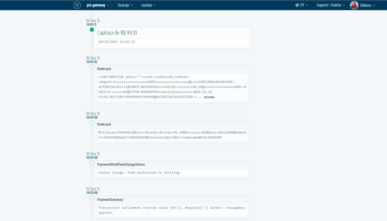 Each box corresponds to the log containing the response of the interaction between VTEX and the partner system. At the top of the box appears the name of the partner who generated the message.
