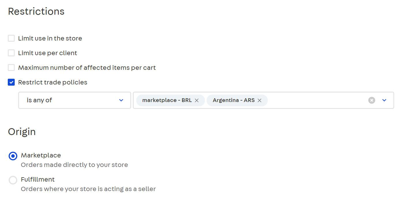 In the example above, the promotion will only apply to orders from the "Marketplace-BRL" and "Argentina-ARS" trade policies, where the store operates as a seller. The promotion will not be available on the VTEX storefront.
