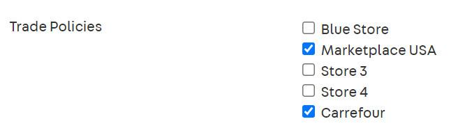 In the example above, the product will only be available to sales channels using the "Carrefour" and "Marketplace" trade policies.