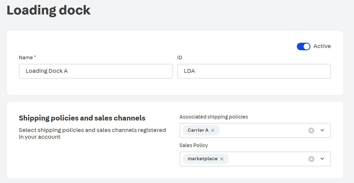 Both settings can be configured on the Shipping strategy page. When creating a loading dock, you must indicate which trade policies will be associated with it. This makes the shipping policies associated with this loading dock available to the linked trade policies. Then, you must link the desired inventory to a loading dock to make the inventory available to the trade policies associated with the loading dock.