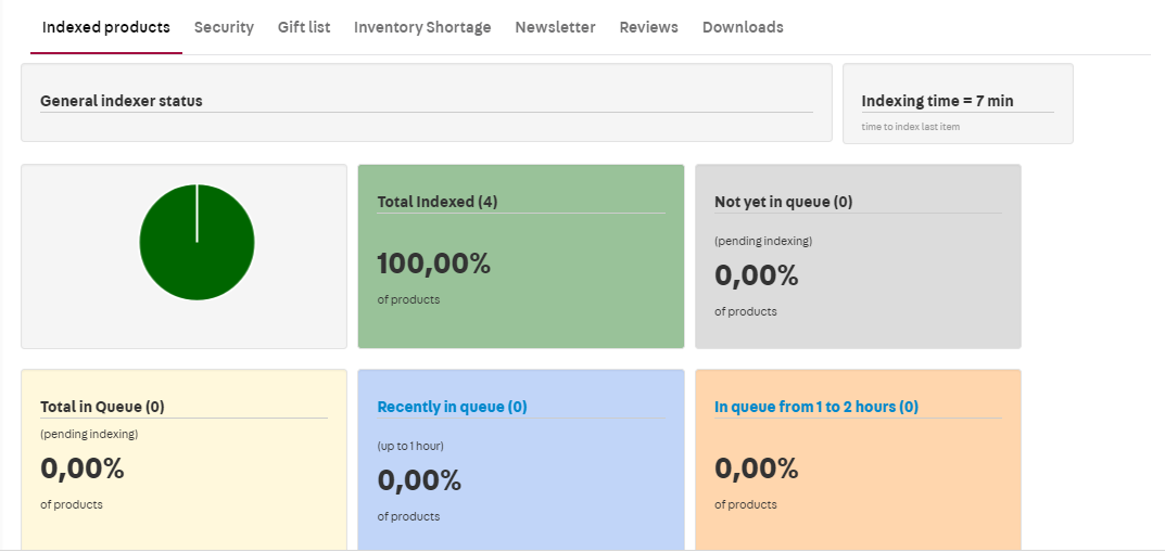 - Total in Queue (Total na Fila): Number and percentage of products that are standing in the indexing queue.