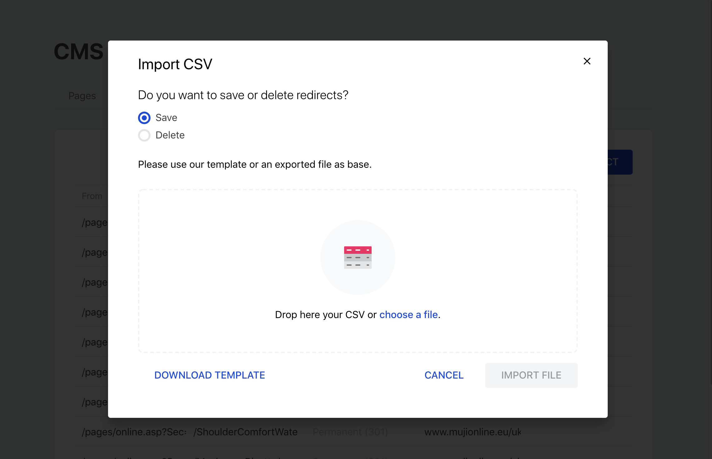 Importbutton and then onDownload Template. Click on theExportbutton if you aim to download and modify the pre-saved redirect list. - Open the spreadsheet template once the download is done and fill out the cells in the suitable columns according to the table below: