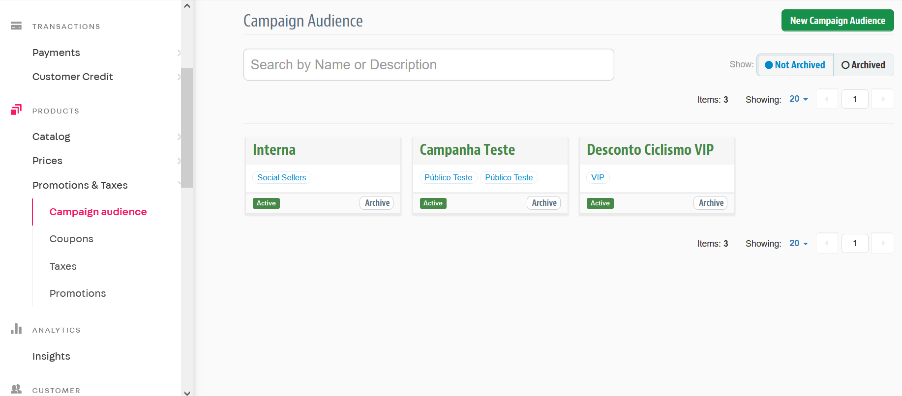 A campaign audience is a way of defining the target audience to which a benefit can be applied. In other words, you can create customer segments based on the definition of some criteria that will be eligible for a given campaign audience and consequently one or more benefits. A campaign audience can be associated with one or more campaign benefits.