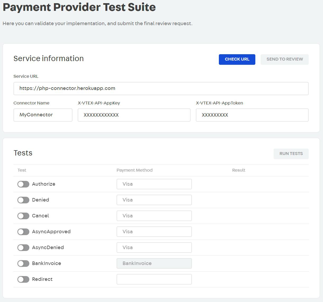 • Redirect flow: This test is divided in two steps. First, we send a Create Payment request to {{ServiceURL}}/payments, expecting the status undefined as a response and the redirectUrl field containing the URL that will be used to redirect the customer. After 15 seconds, we expect to receive another response in the same format via a POST with the URL sent in the callbackUrl field and with status approved. When the integration is in production, this last call made by callbackUrl is authenticated with the partner's environment keys: vtex-app-key and vtex-app-token. Learn more about the callback flow in the Payment Authorization section. Connectors that will use Redirect don’t need to pass all Test Suite tests, only the Redirect test.