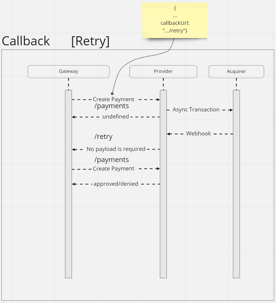 4. The provider, upon receiving the call through the webhook, calls the retry endpoint to the gateway, requesting it to call the /payment endpoint again. Retry does not require any payload.