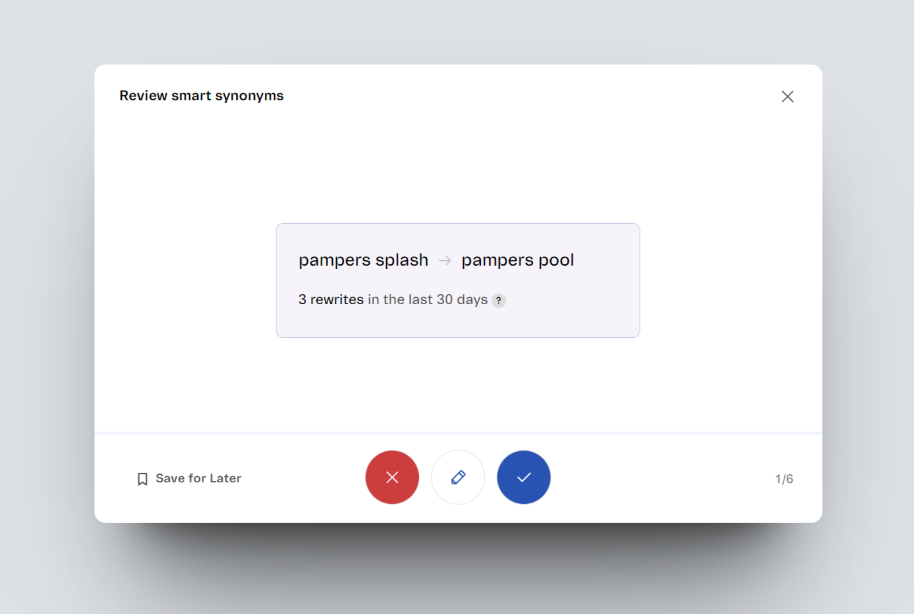 A modal will display the first synonym suggestion. Each suggestion shows the searched term, the proposed synonym, and the number of times customers have used the second term to replace the original term in the last 30 days.