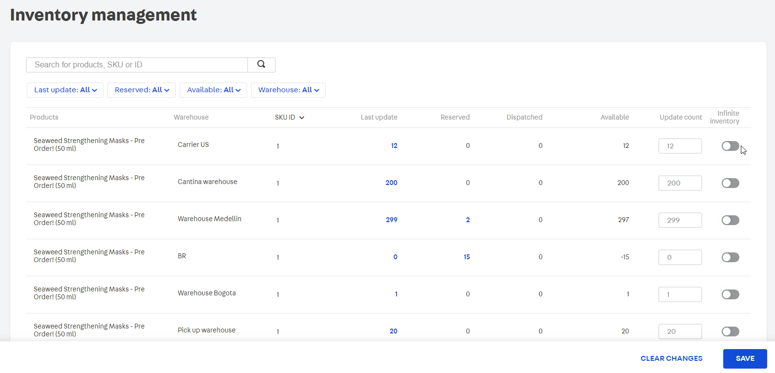 To make SKUs available, include the available units of each SKU for each corresponding inventory. The updated quantity must also correspond to the quantity of items available in your inventory. This way, you ensure that the SKUs available in your store are actually available for sale.