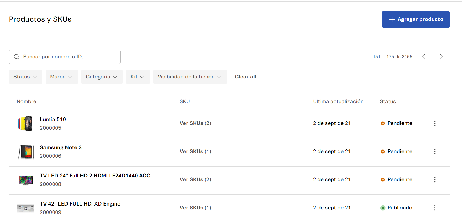 - Identificar más fácilmente los productos y SKU que tengan información pendiente para estar disponibles para la venta mediante el nuevo status Pendiente.