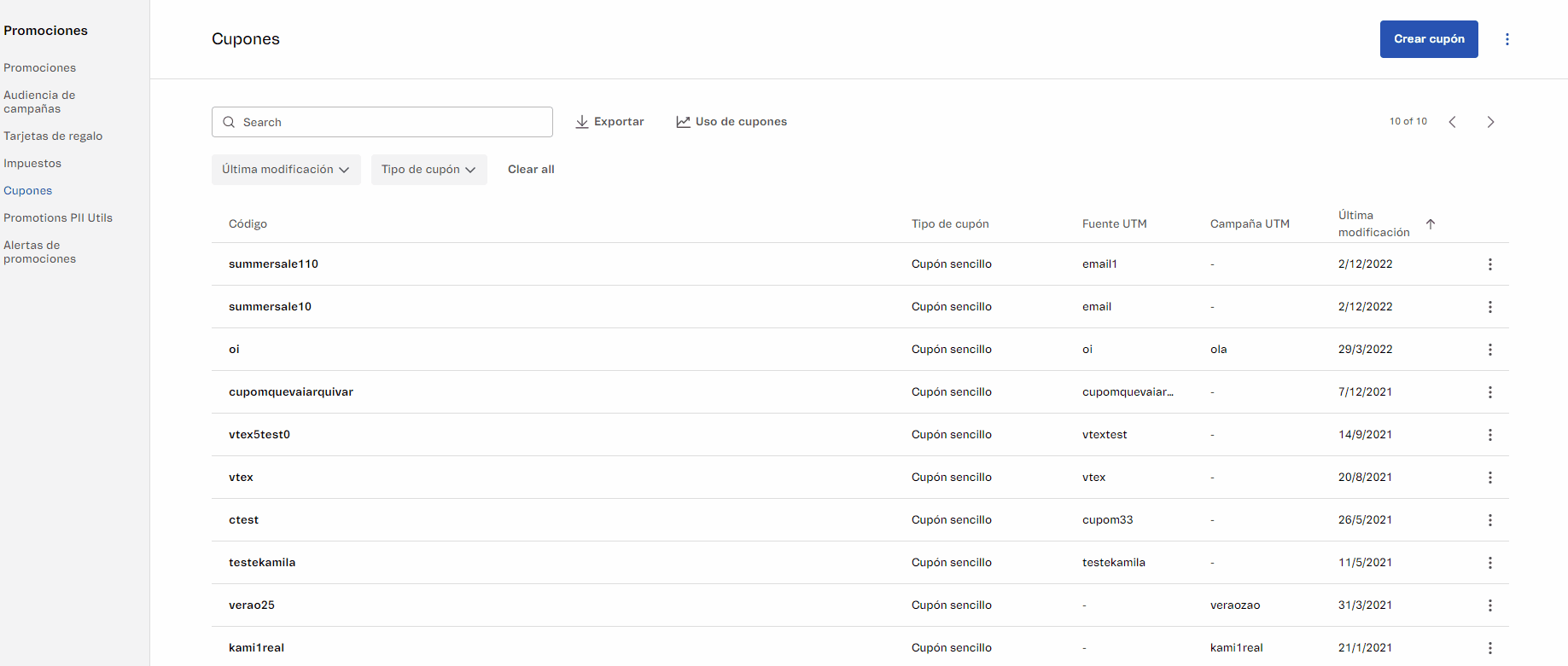 La nueva lista de Cupones muestra todos los cupones registrados en tu tienda, permitiendo gestionar los datos y analizar en qué pedidos se han utilizado.