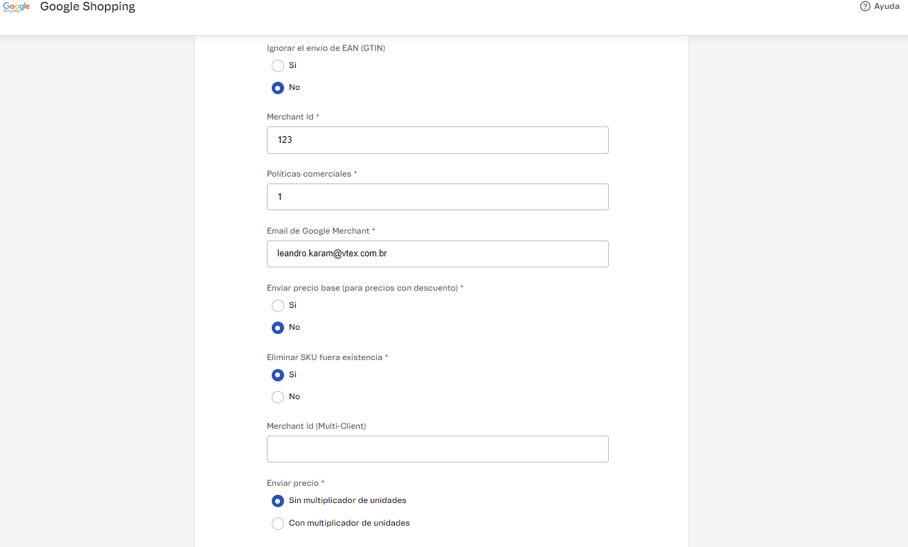 Antes, el registro de la integración con Google Shopping incluía la opción Considerar descuento para el pago con boleto al precio enviado que ahora ha sido sustituida por Aplicar descuento al precio enviado. La actualización permite que las tiendas VTEX puedan utilizar una de las siguientes dos opciones para configurar el precio enviado a Google Shopping: