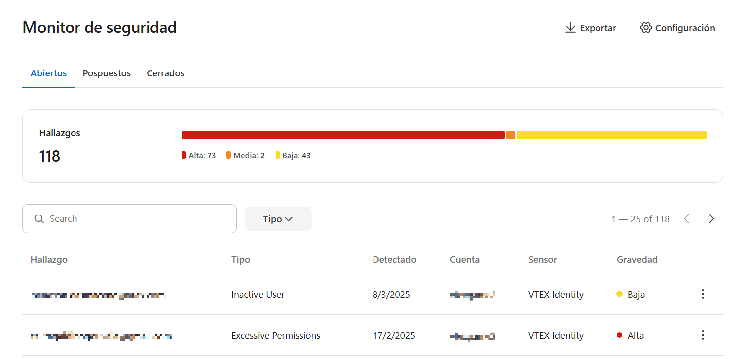Ahora puedes exportar los hallazgos de Security Monitor a un archivo CSV. Esta nueva funcionalidad brinda una mayor autonomía para registrar, compartir y profundizar en el análisis de los riesgos de seguridad detectados en tu cuenta.