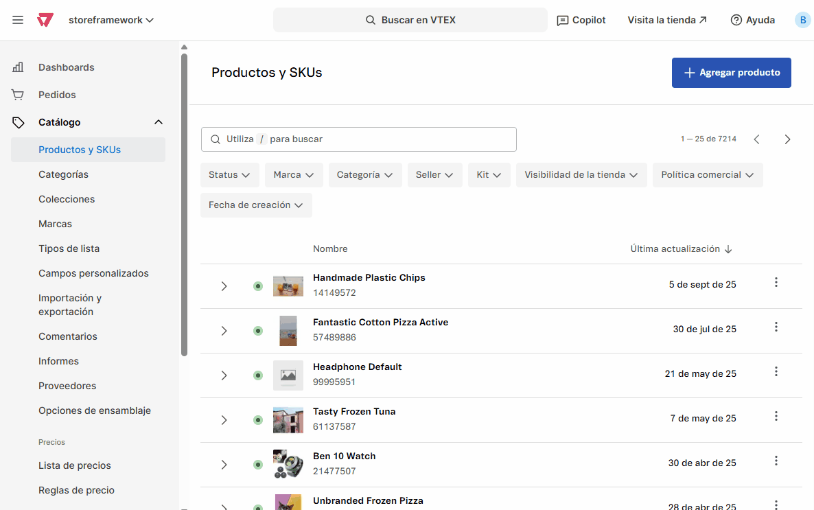 • Dar feedback: botón que te redirige a un formulario para enviar tus opiniones sobre los productos VTEX accesibles a través del Admin.
