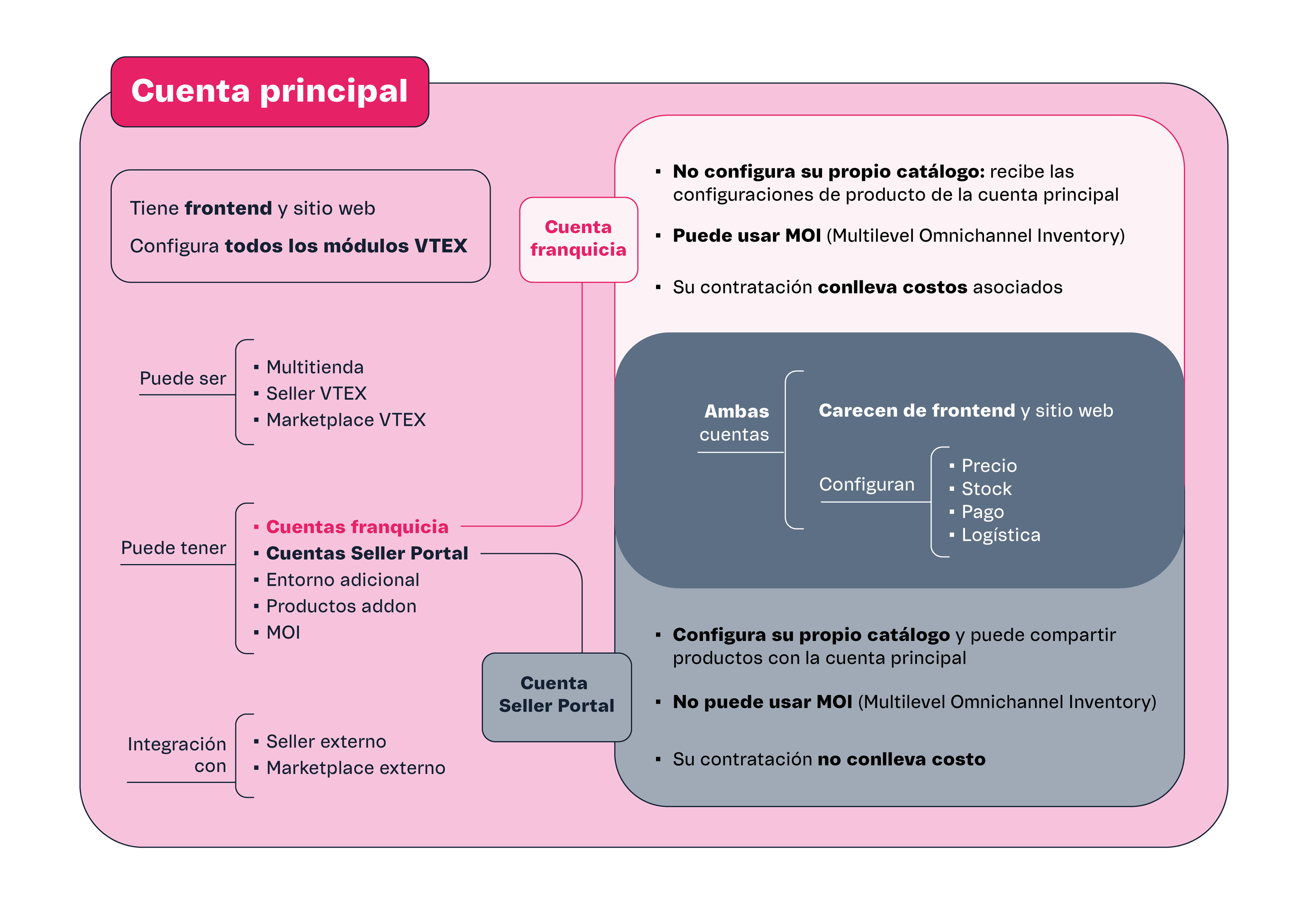 • Cuenta franquicia: es una cuenta asociada a la cuenta principal. No tiene un sitio web propio y su característica más importante es que no permite configurar un catálogo propio, sino que lo recibe de la cuenta principal. Este tipo de cuenta se recomienda para operaciones que tienen tiendas físicas, franquicias y representantes de marca. No es obligatorio que la tienda tenga una red de franquicias para beneficiarse de los recursos de una cuenta franquicia VTEX.