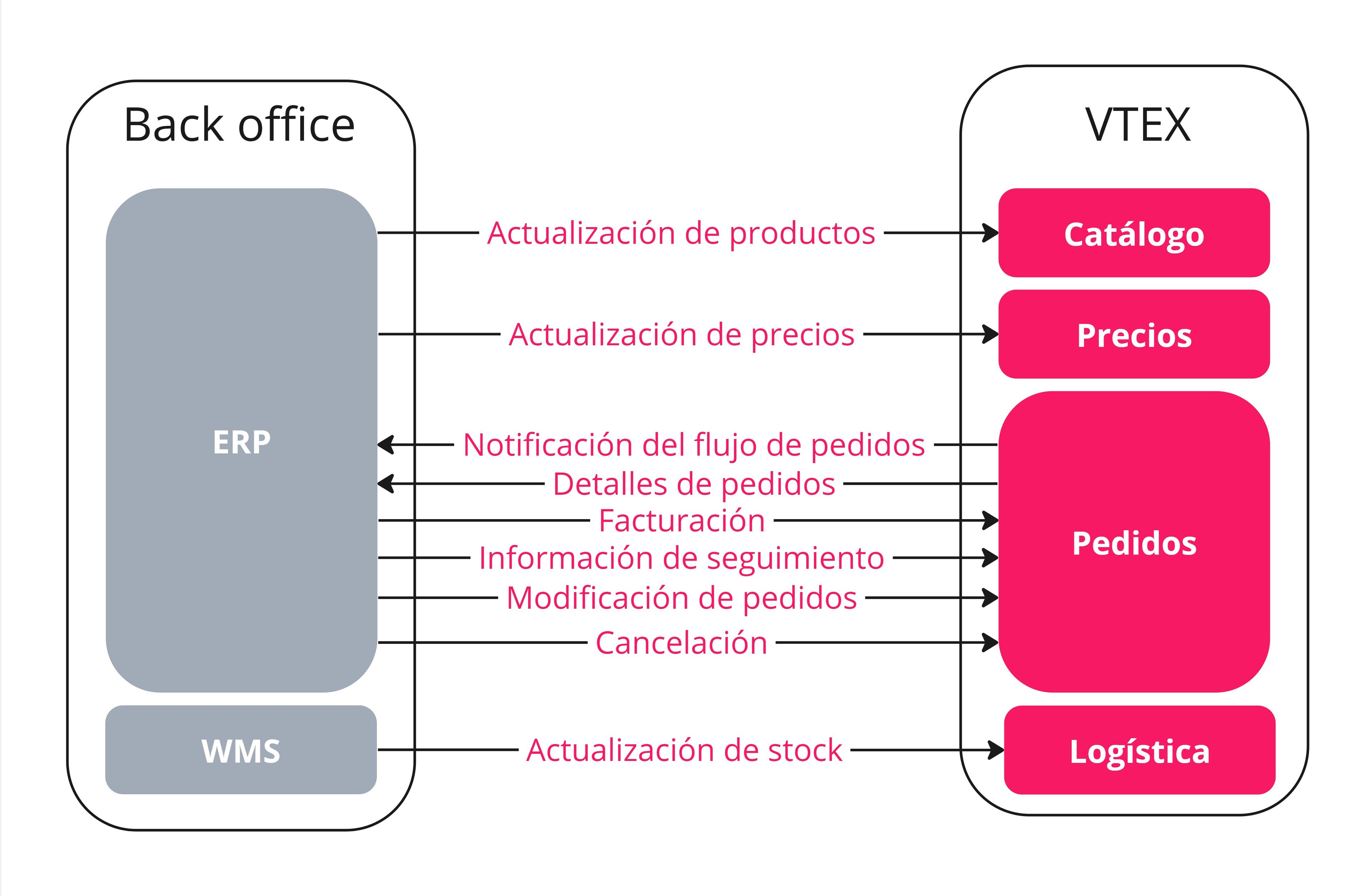 La integración de pedidos permite la comunicación entre la aplicación de back office, ya sea ERP o WMS, y el OMS (Order Management System) de VTEX. Dicha integración desempeña un papel fundamental al: