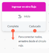 Cuando se termina la ejecución del flujo hijo, la carta Ingresar en otro flujo nos da la oportunidad de tener dos rutas, siendo así la única carta de acción que utiliza este concepto (para entender el concepto de ruta, visita el artículo de cartas de decisión). Estas dos rutas posibles se basan en cómo terminó el flujo hijo. Si se completó sin problemas, el flujo tomará la ruta de Complete , y si el flujo hijo expiró, el flujo padre utilizará la ruta de Caducado.