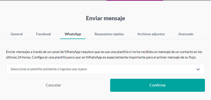 El envío de mensajes por un canal de WhatsApp requiere usar una plantilla si no ha recibido un mensaje de un contacto en las últimas 24 horas. Configurar una plantilla para usar en WhatsApp es especialmente importante para el primer mensaje en su flujo. Lea el artículo sobre el envío activo en WhatsApp.