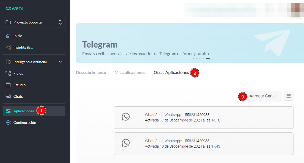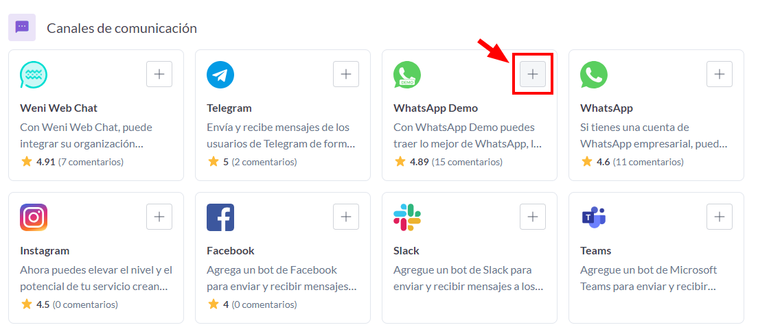 - Dentro de Aplicaciones encontrarás un menú con los canales compatibles con la Plataforma Weni.