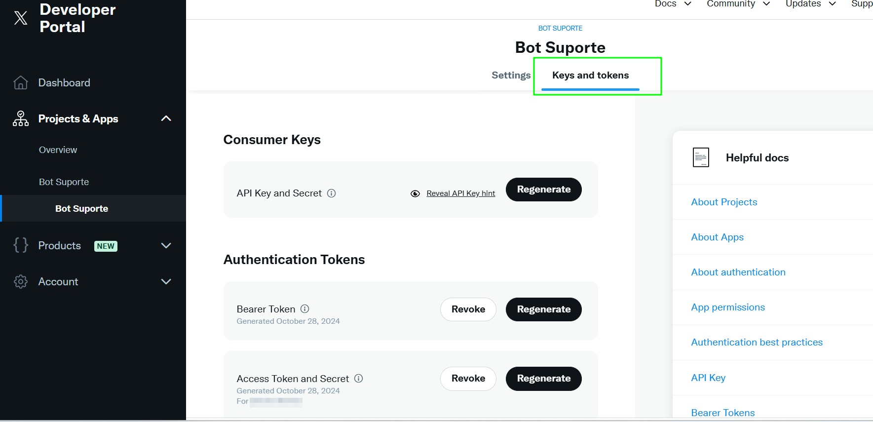 1. Ahora necesitas crear las claves y tokens para tu aplicación, que serán necesarios al crear tu canal. Vuelve a tu aplicación y selecciona la pestaña Keys and****Tokens. Haz clic en Regenerar en las secciones Consumer API Keys y Access token & access token secret. Las claves y tokens deben generarse con los permisos de ""Leer, Escribir y Mensajes Directos"".