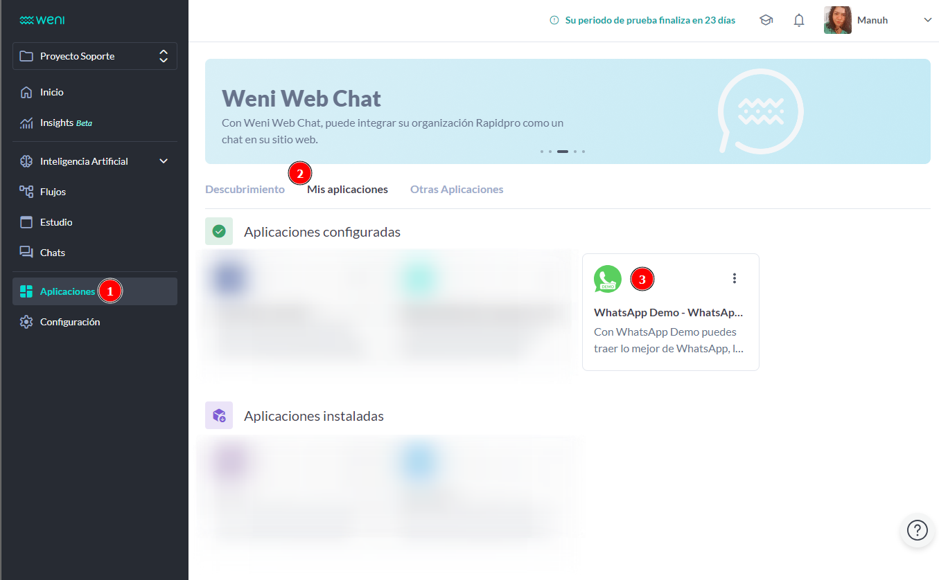 - En tu proyecto, haz clic en Aplicaciones > Descubrimientos > Añade WhatsApp Demo.