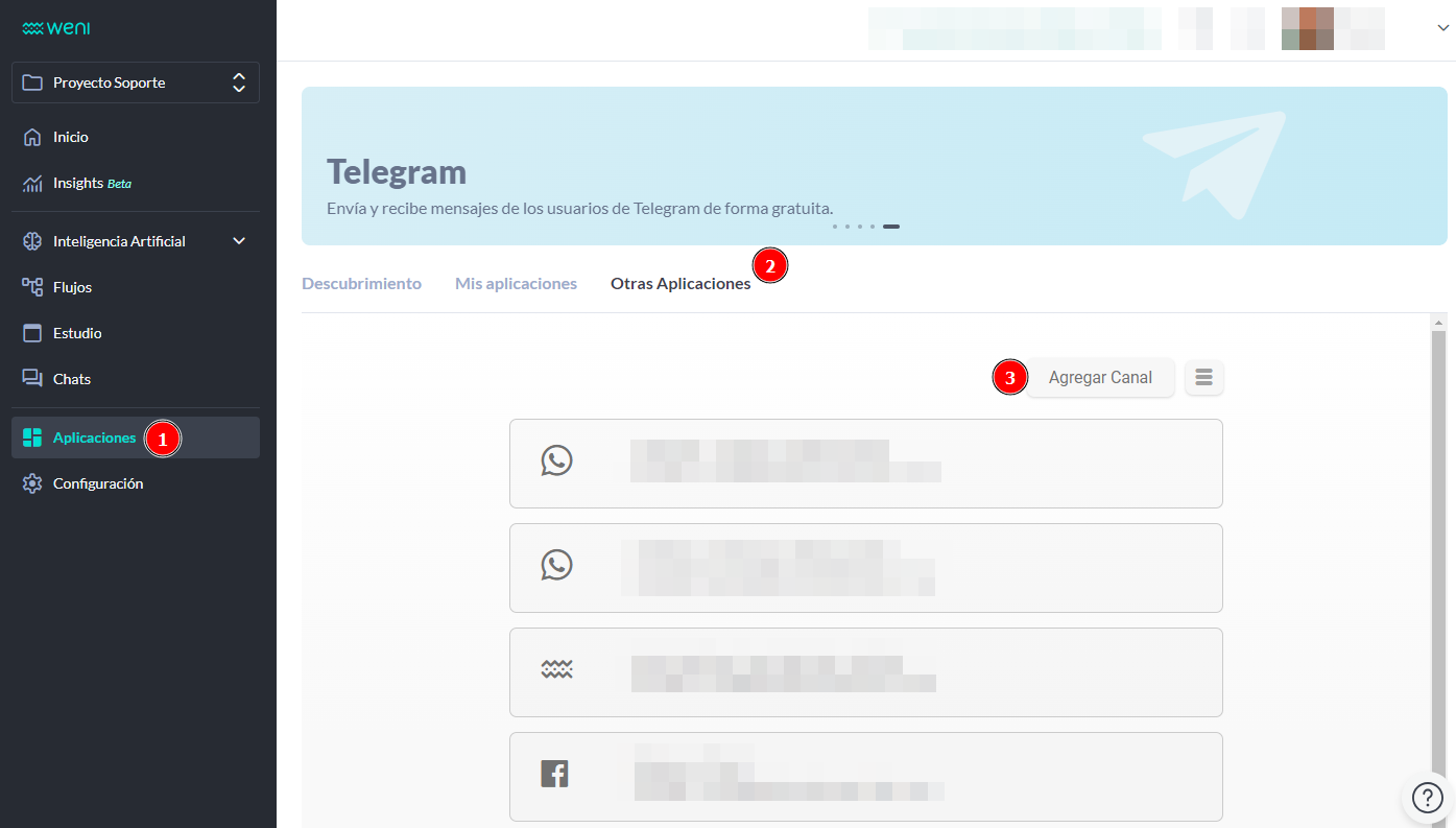 La plataforma Weni tiene varios canales SMS que pueden configurarse para recibir y enviar mensajes y, de acuerdo con la aplicación elegida, tendrán diferentes configuraciones a realizar. Para activar un canal, ve al módulo Aplicaciones> Otras Aplicaciones > Agregar Canal