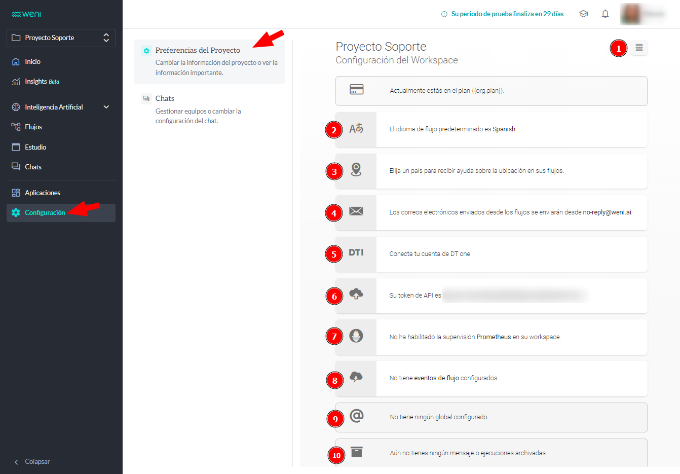 En este artículo explicaremos cada opción de las configuraciones generales que su organización tendrá en nuestra plataforma. Han sido enumeradas del 1 al 10 (foto abajo) y explicadas minuciosamente. Para acceder a ellas, debe hacer clic en el menú lateral dentro de su proyecto.