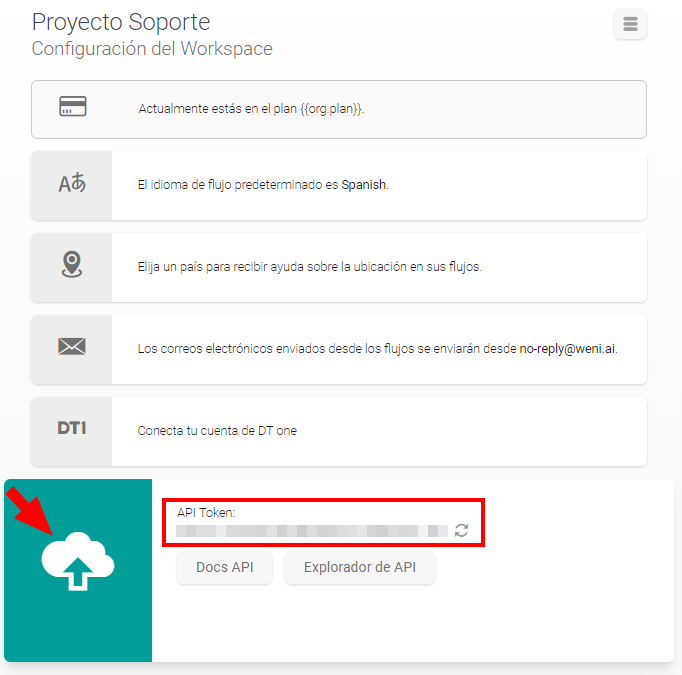 Aquí podrá verificar el token de su API. El token es la clave de acceso para que aplicaciones externas puedan interactuar con la API de la Plataforma Weni.