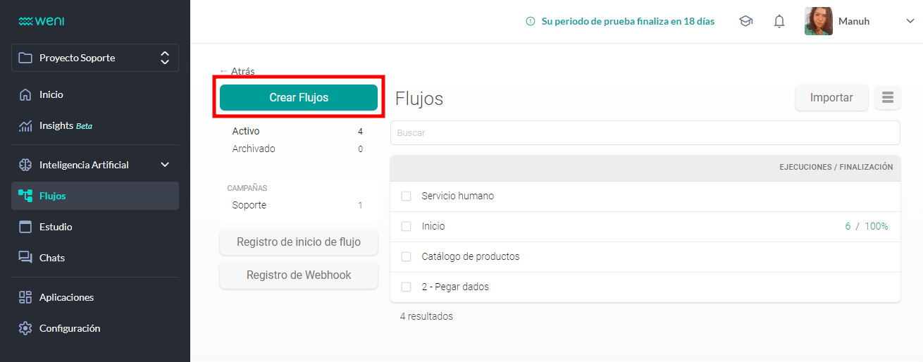 1. Primero, vamos a hacer click en el botón de flows en el Menú lateral.