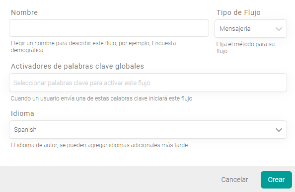 1. Después de eso, un pop-up para creación de flujo aparecerá en si pantalla. Esta esta formada por 4 campos que pueden ser llenados: Nombre , Activadores de palabras clave globales , Idioma, Tipo de Flujo.