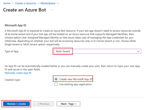 Selecciona el tipo de aplicación; se recomienda multiinquilino. Luego, selecciona Revisar + Crear.