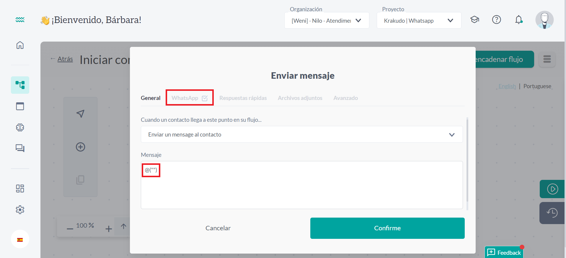 En este momento, también es posible añadir variables que harán el mensaje más personalizado, como, por ejemplo, la variable @contact.name, que llama al usuario por el nombre registrado en su propio WhatsApp.