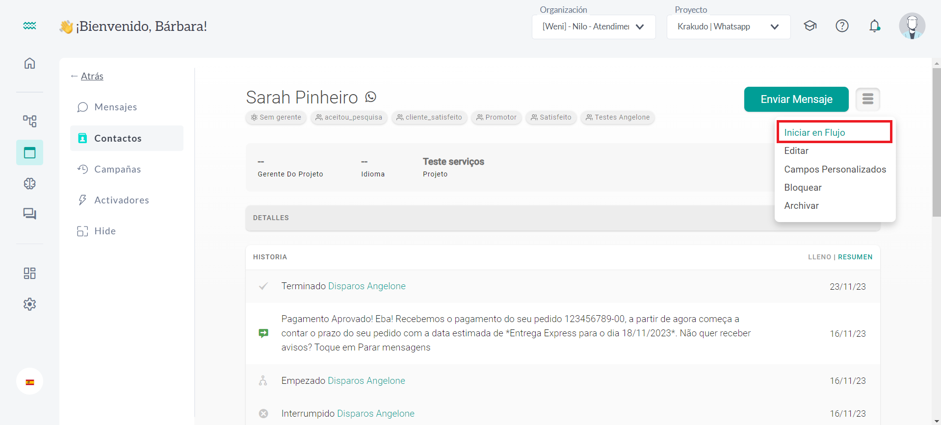 También es posible enviar un Template Message desde el módulo ""Estudio"", seleccionando el contacto al que deseas enviar el mensaje y haciendo clic en el menú de opciones, ubicado en la esquina superior derecha. Luego, simplemente selecciona ""Iniciar en el Flujo"", elige el flujo y envía. Esta es otra posibilidad que ofrece la Plataforma Weni para realizar el envío activo. Observa la imagen a continuación: