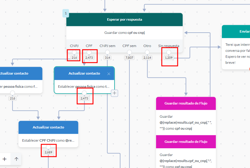 Los marcadores de ruta son números guía que aparecen debajo de cada carta de acción y decisión, mostrando cuántas personas han pasado por esa ruta en el flujo. Es una herramienta muy interesante para identificar cuál es el camino más frecuentado por tus usuarios, además de actualizarse siempre en tiempo real. También es útil para identificar ciertos cuellos de botella, como cuando una pregunta retiene a un usuario demasiado tiempo en el flujo.