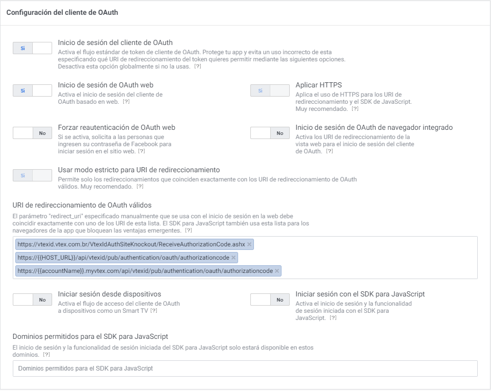 Para activar el inicio de sesión por OAuth2 a través de Facebook, accede al Admin VTEX > Configuración de cuenta > Autenticación y completa los campos Client ID y Secreto del cliente, tal como se describe en el artículo Configurar inicio de sesión con Facebook y Google.