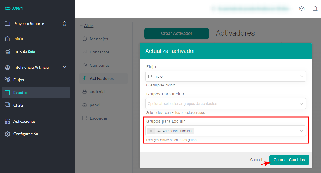 ATENCIÓN: si los contactos no son añadidos a un grupo de control, el chatbot entrará en conflicto e interrumpirá la atención humana, enviando los mensajes estándar configurados en su entorno.
