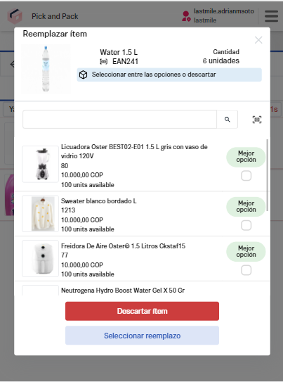 La pantalla Reemplazar ítem habilita los productos asociados al producto a reemplazar. Puedes utilizar el filtro de búsqueda.