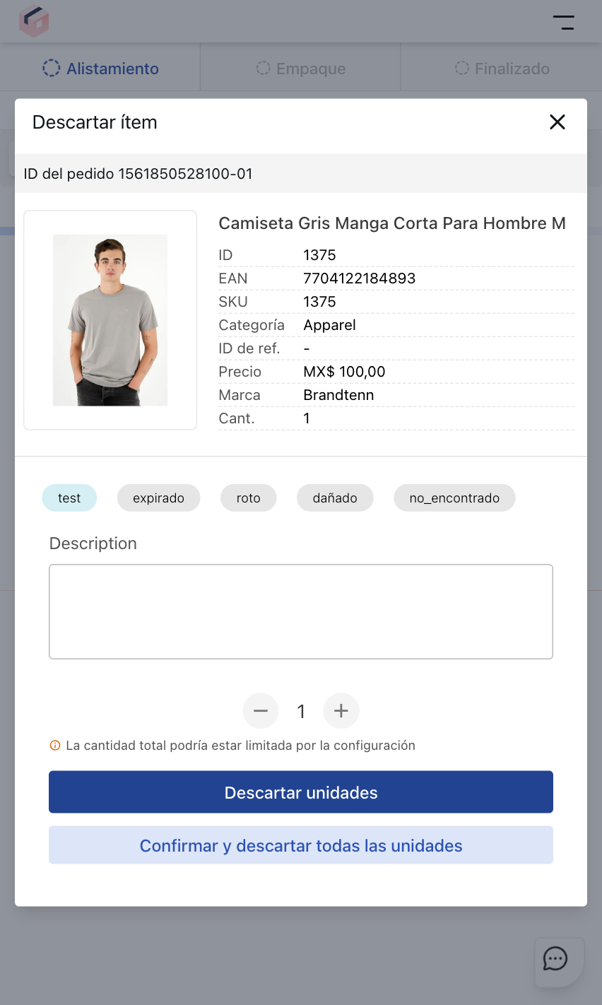 Durante el proceso de alistamiento puedes actualizar manualmente la cantidad de un producto. Esta acción se puede realizar después de recibir una solicitud del cliente, ya sea por videollamada o mensaje de texto, o cuando el stock disponible en la tienda sea diferente al registrado inicialmente.