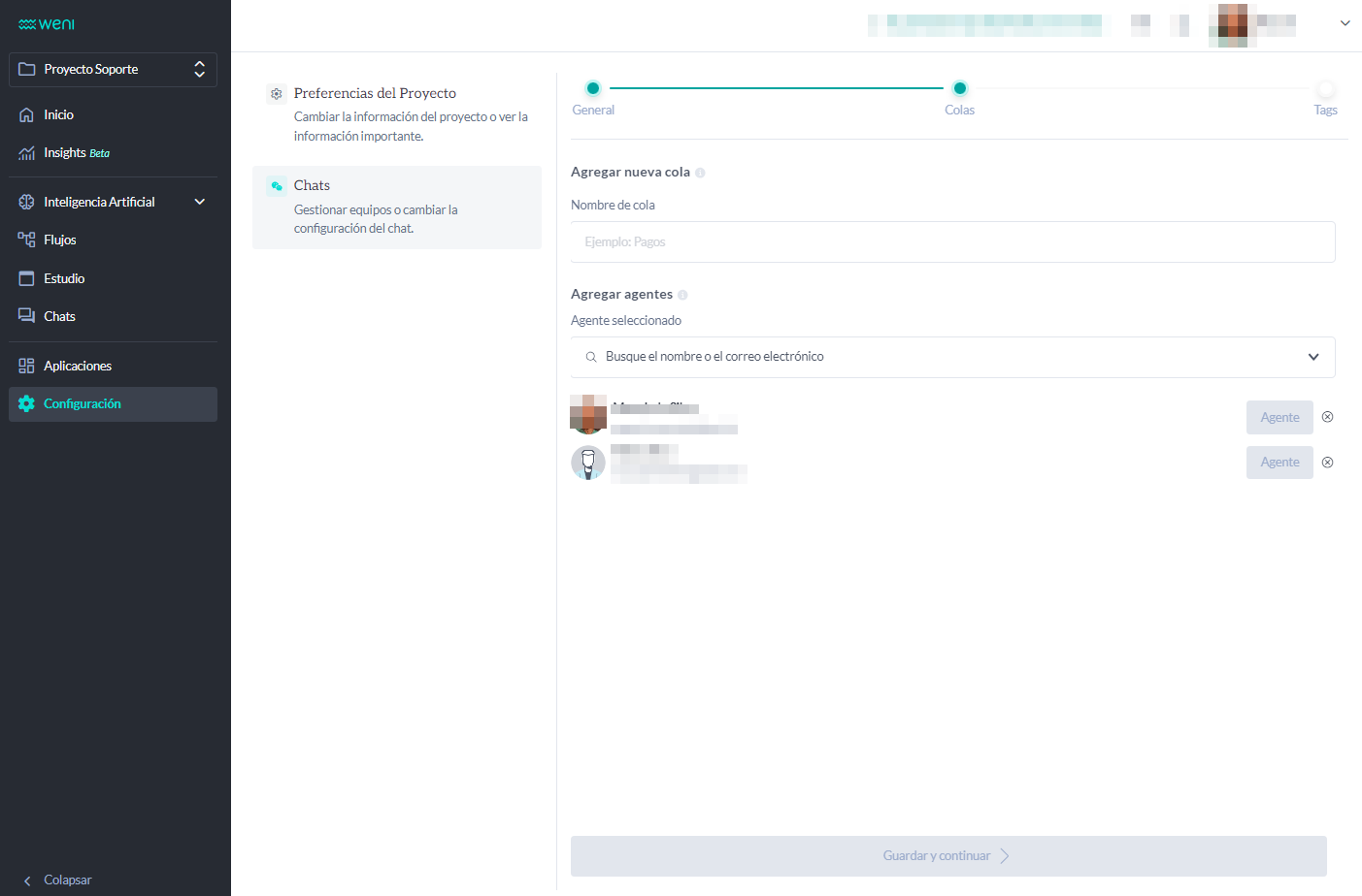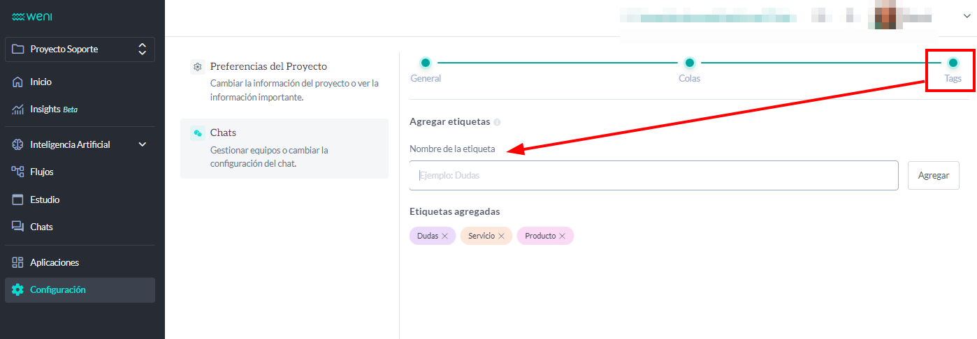 Toda esta gestión se lleva a cabo dentro del proyecto, en Configuraciones > Chats.