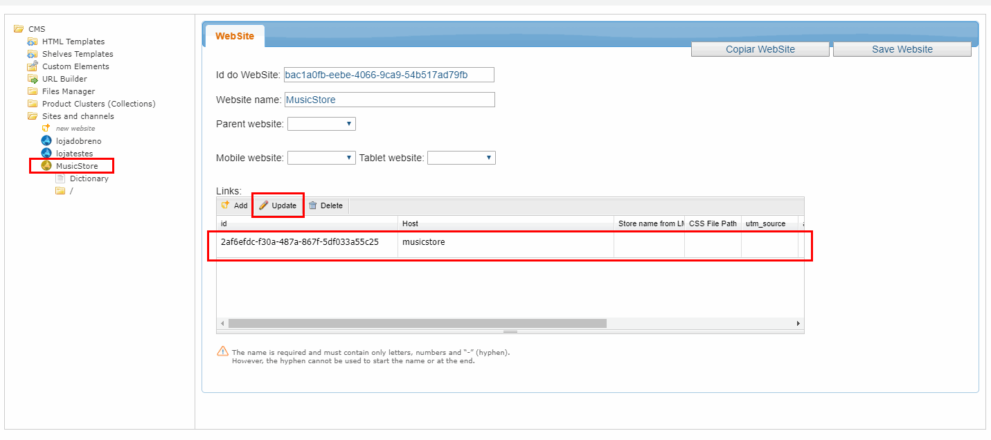 2. Seleccione el Binding (línea seleccionada en la imagen abajo) y haga clic en Update: