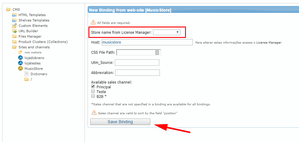 3. En la pantalla que será mostrada, el campo Store name from License Manager estará en blanco. Con eso, haga clic en la flecha que aparece en ese campo y seleccione el nombre de su tienda.