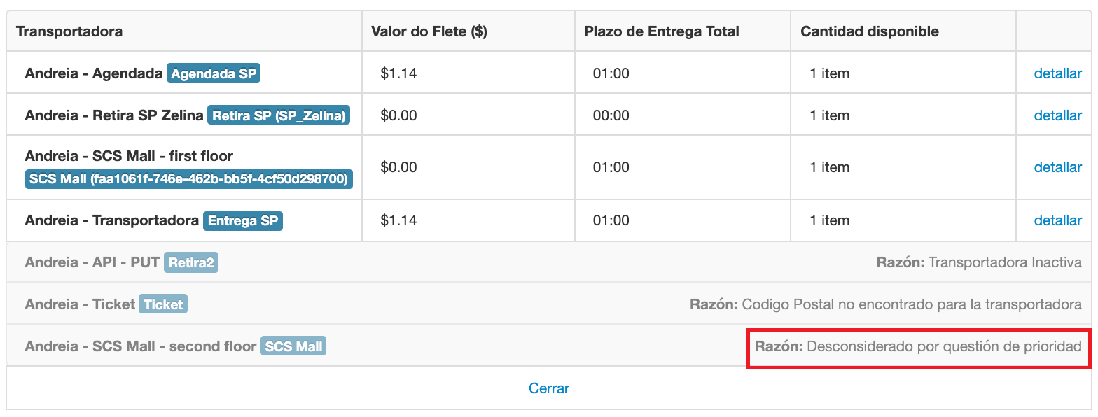 Cuando se simula una entrega en la que hay métodos de envío con el mismo nombre para puntos de recogida en diferentes políticas de envío, solo uno estará disponible. Los otros puntos serán descartados y no serán mostrados por la interfaz, o se mostrarán con el mensaje: