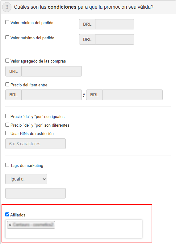 Para que una promoción se aplique correctamente en un marketplace es necesario seleccionar el afiliado deseado. El afiliado es el partner asociado al marketplace que disponibiliza los productos promocionales. A continuación se detallan los pasos a seguir para seleccionar correctamente un afiliado a la hora de configurar una promoción.