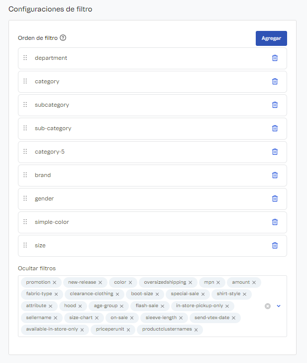 Orden de las facetas: orden en el que se mostrarán las facetas en la tienda. Si no hay ninguna faceta seleccionada en la sección, el orden predeterminado es alfabético.