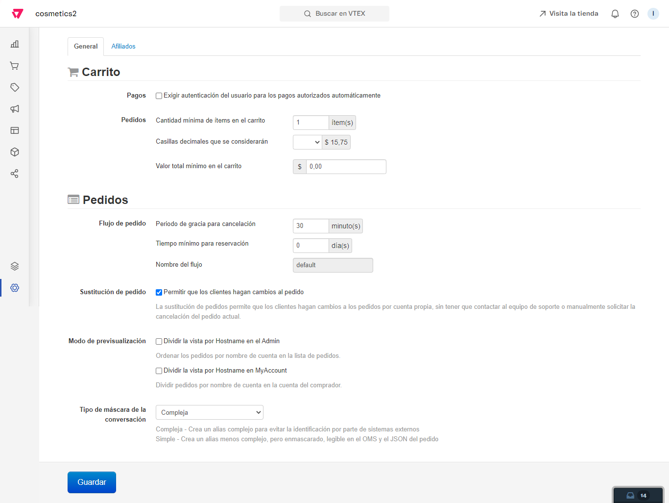 • Cantidad mínima de ítems en el carrito: Estándar: 1 ítem. Esto impedirá que el cliente cierre la compra sin tener al menos el valor en cantidad de ítems igual al definido en este campo.