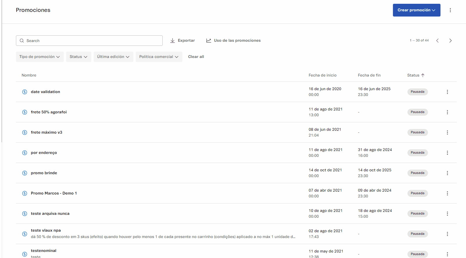 La página muestra la lista con las promociones registradas en tu tienda y su información básica: