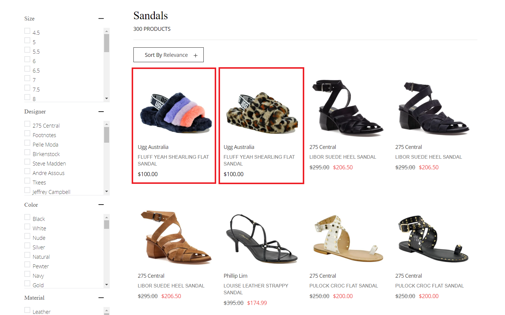 A continuación, vea un ejemplo de separación de SKUs por color. La sandalia que se destaca en la siguiente imagen se exhibe en dos colores en el resultado de la búsqueda: