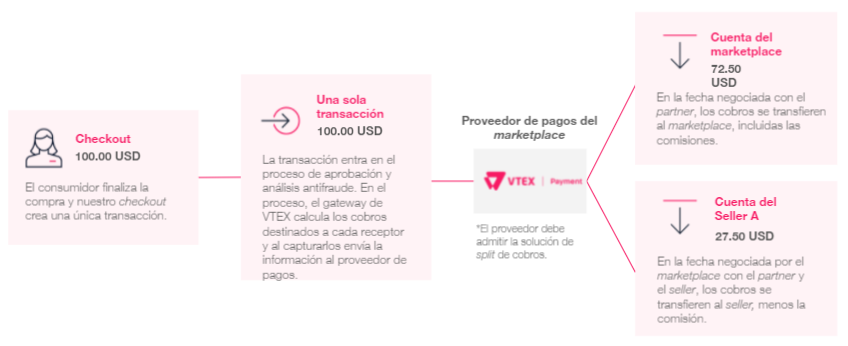 Los marketplaces pueden indicar cómo se debe dividir el importe de compra y qué porcentaje está reservado para el propio marketplace al definir comisiones automáticas por costo total de productos, flete o categoría de SKU para cada seller. En este caso, la transacción solo la procesa el proveedor de pagos del marketplace que será responsable de pagarle a cada seller.