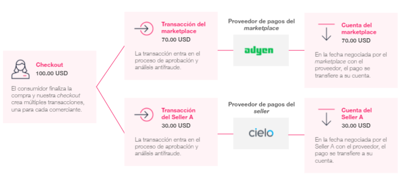 El pago no siempre lo procesa el proveedor de pagos del marketplace, sino que lo procesan los proveedores de cada comerciante (el proveedor de pagos de cada seller es responsable de procesar su porción de la transacción).