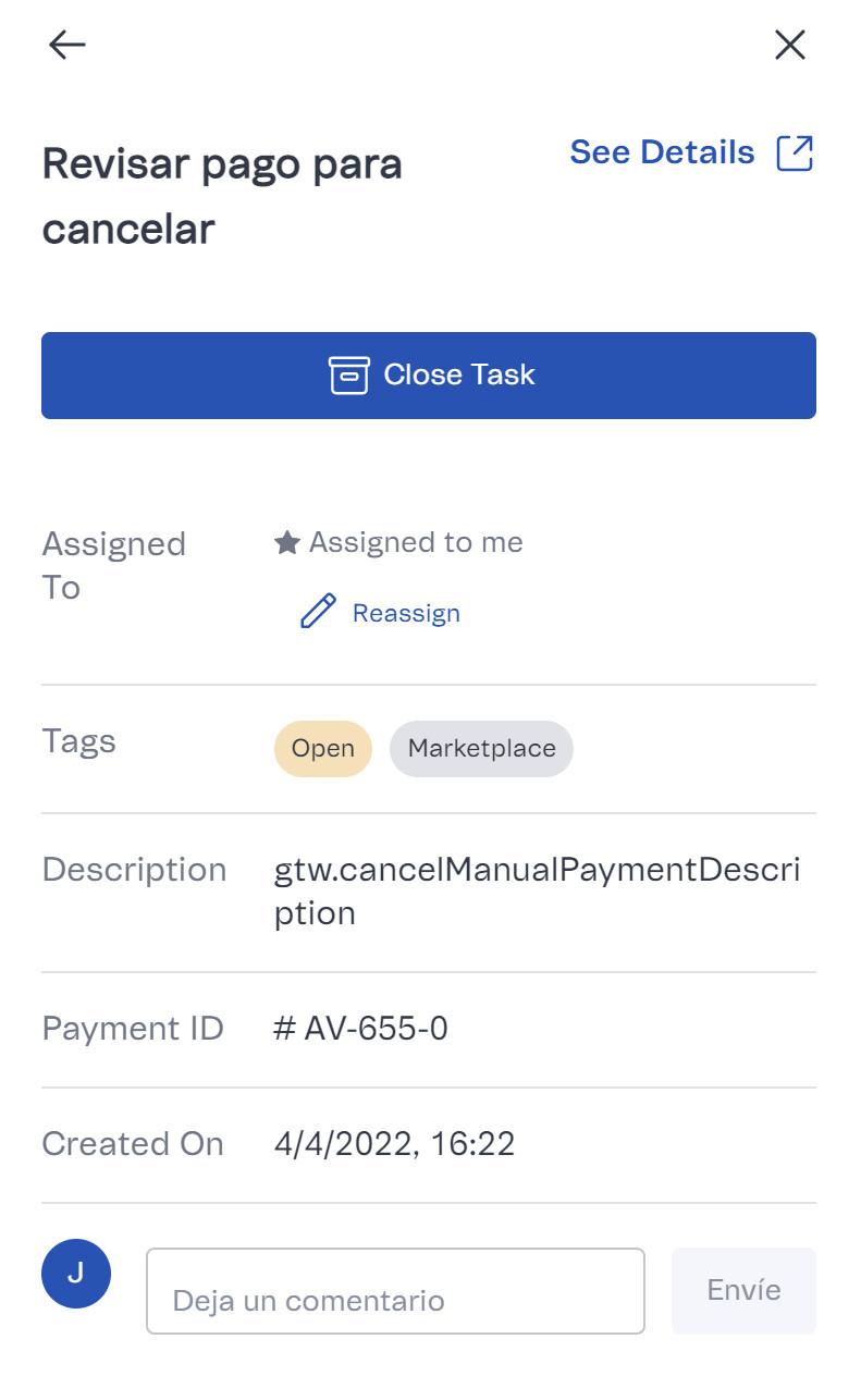 - ID de pago/ID de pedido: si la tarea está relacionada a un pedido, el campo mostrará el ID del pedido. Por otro lado, si está relacionada a un pago, el campo mostrará el ID del pago.