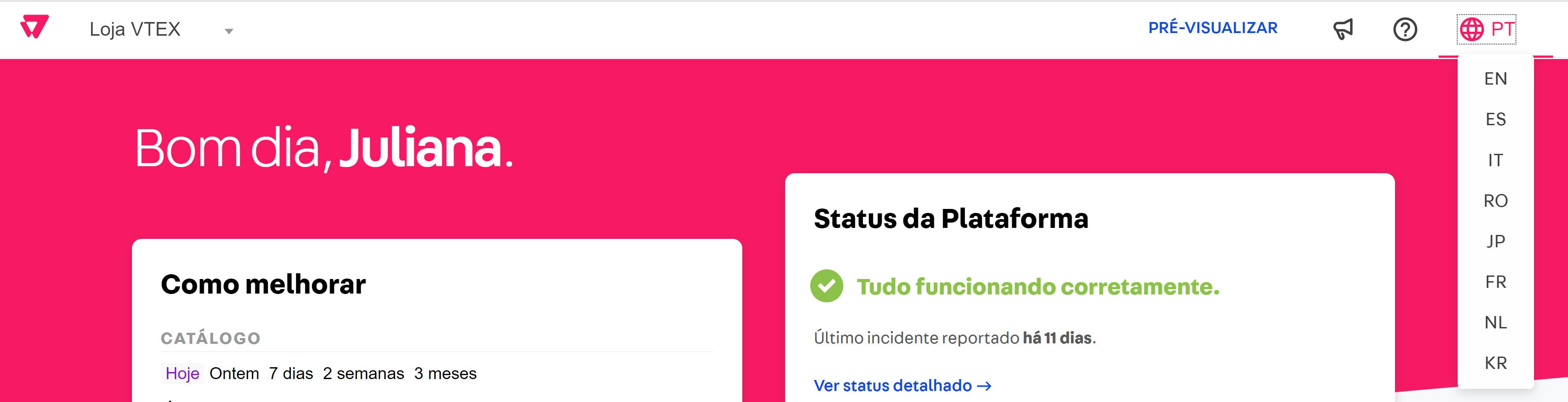 Para visualizar o admin da VTEX nos novos idiomas, selecione NL para holandês, FR para francês ou KR para coreano na lista de idiomas no canto superior direito da tela.