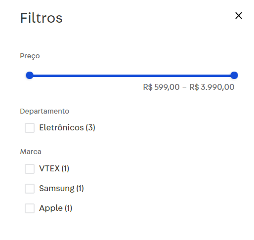 Além das configurações do VTEX Intelligent Search, é preciso entrar em contato com o time de suporte da VTEX para habilitar a funcionalidade de filtros no inStore.